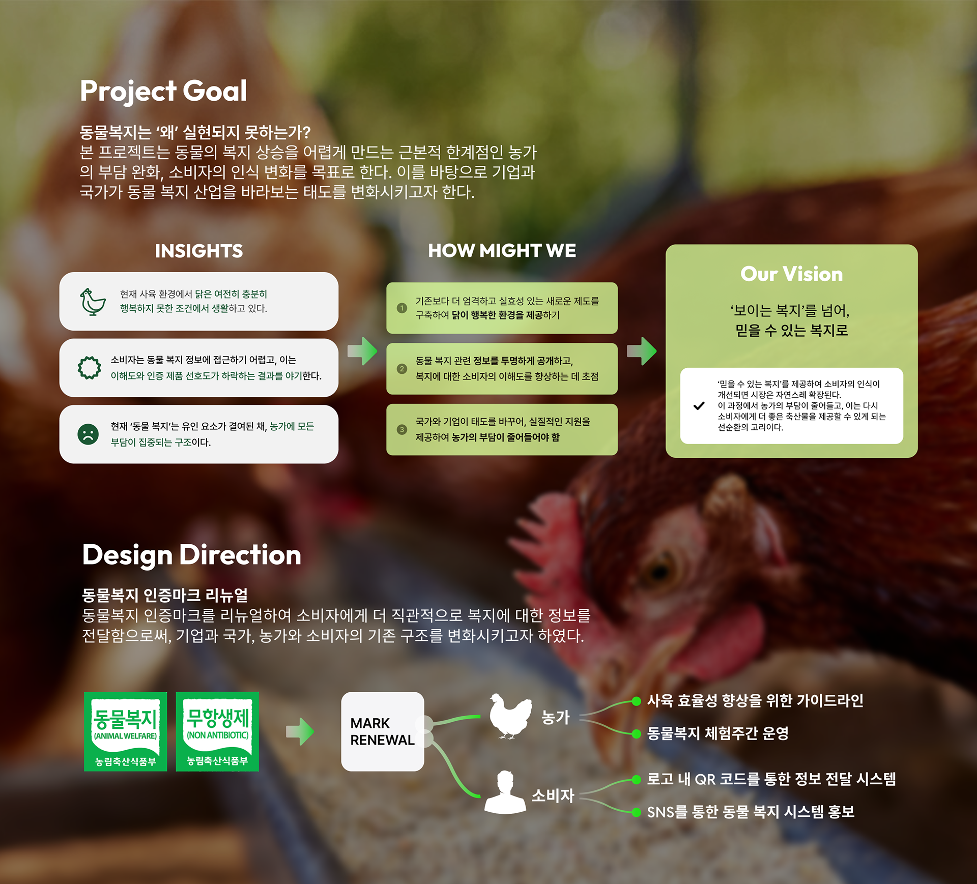 일으켜 농장에서 살아가는 닭의 행복에 기여하고자 합니다.